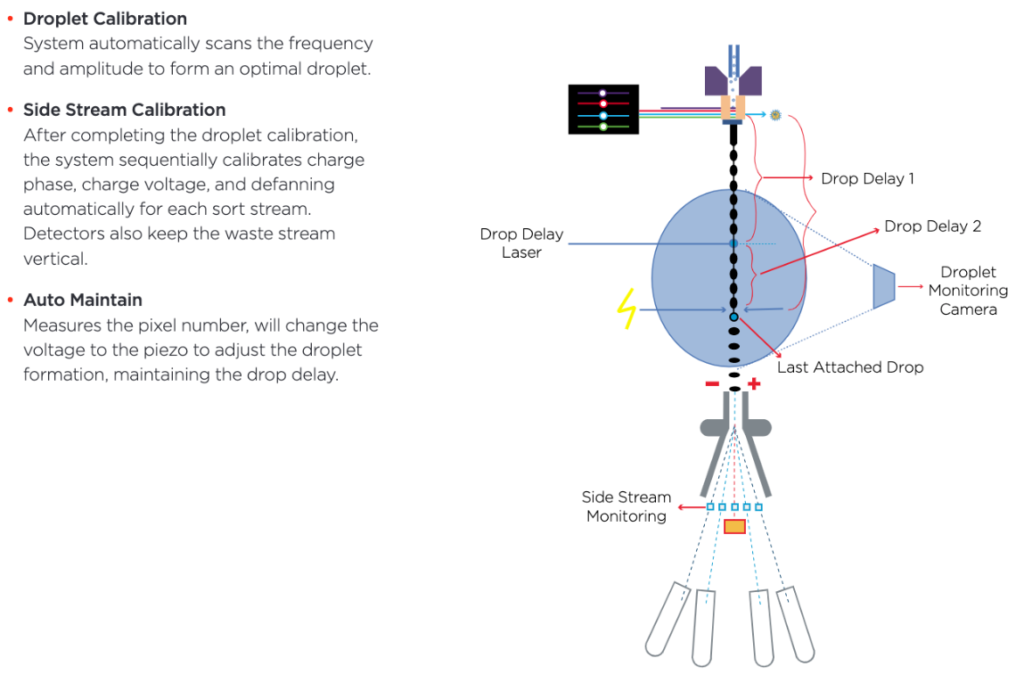 Droplet Calibration(液滴校準) | 自動掃描頻率與振幅,形成最佳液滴大小與間距。 | 精確控制液滴生成,使每個細胞位於液滴中心。 | 提高分選精準度,減少錯誤充電與液滴偏移。 |
