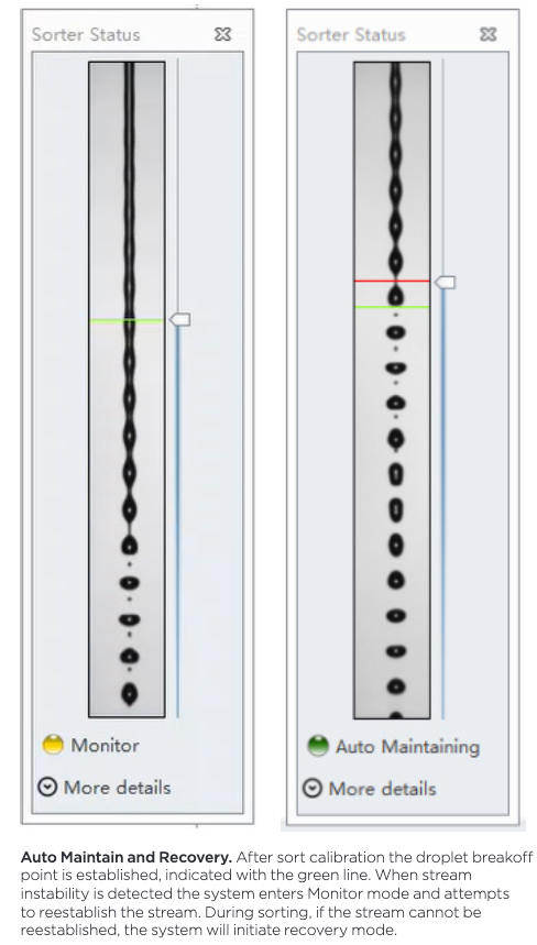 Auto Maintain(自動維持) | 系統量測液滴影像像素,依據變化調整壓電驅動電壓以維持液滴延遲(drop delay)。 | 閉環回饋控制,自動修正液滴生成偏差。 | 長時間操作仍能保持穩定的分選軌跡與精度。 |