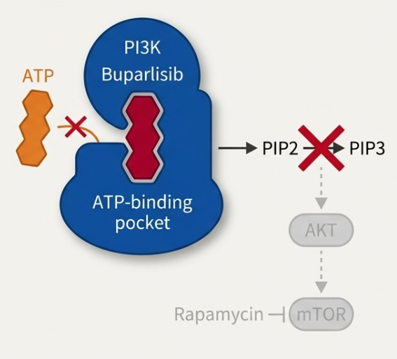 Buparlisib (BKM120) 抑制 PI3K 的具體分子機制主要涉及競爭性結合與訊號傳導阻斷