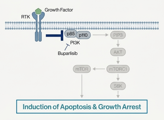 • 訊號中斷: 由於 Buparlisib 的抑制,PIP3 無法生成。PIP3 的缺失意味著下游的關鍵蛋白 AKT (蛋白激酶 B) 無法被招募到細胞膜上進行活化,。