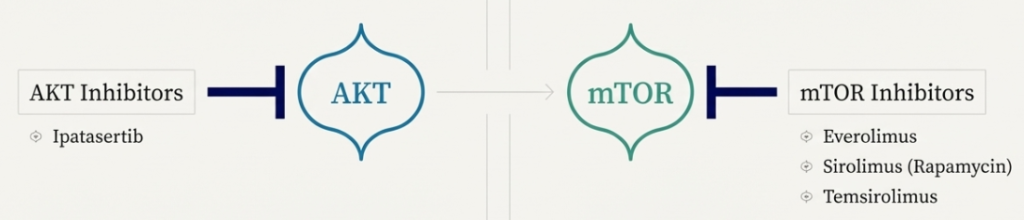 • 生理後果: 這導致負責蛋白質合成 (如 S6K, 4EBP1)、細胞週期進程 (如 Cyclin D, CDK4/6) 以及細胞存活的機制全面停頓,最終抑制癌細胞增殖並誘導其凋亡