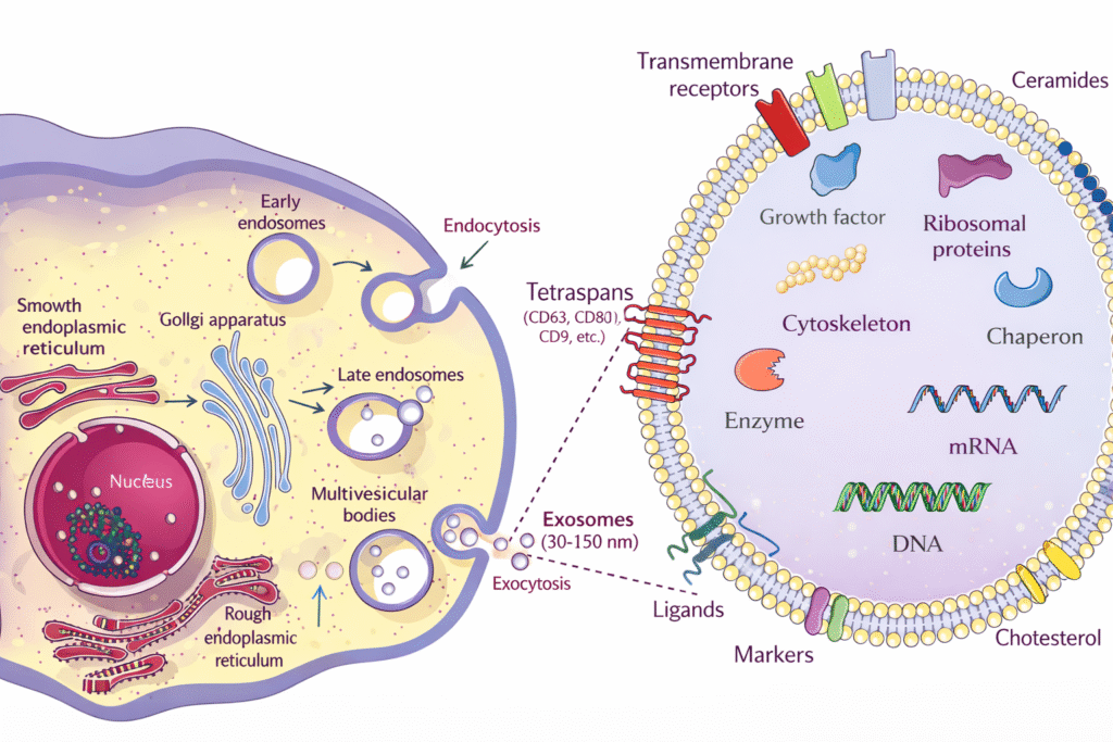 | 外泌體 Exosomes (sEVs) | 由細胞膜內吞→形成 early endosome → ILVs → MVB → MVB 與膜融合釋放 | 30–150 nm | 蛋白質(tetraspanins/CD9/CD63/CD81、ESCRT 蛋白/Alix/Tsg101)、核酸(mRNA/miRNA/lncRNA/DNA)、脂質(磷脂/膽固醇/鞘脂) | 細胞間通訊、信號傳遞、基因表達調控、生物標記物(biomarker) |