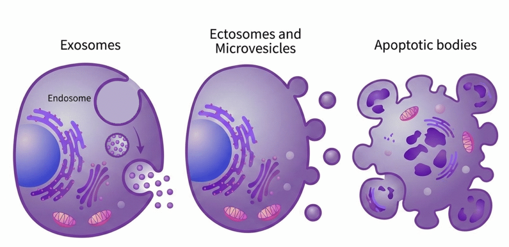 | 凋亡體 Apoptotic bodies | 細胞程序性凋亡之後膜局部 blebbing → 片段化釋放 | 500–2000+ nm | 細胞器、核片段、DNA 片段、大分子複合體 | 清除凋亡細胞碎片、啟動免疫反應、抗原呈現 |