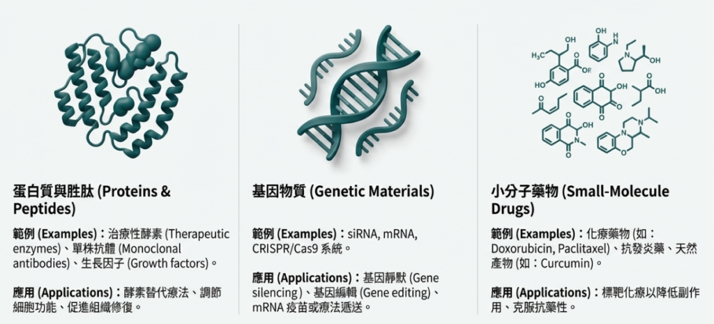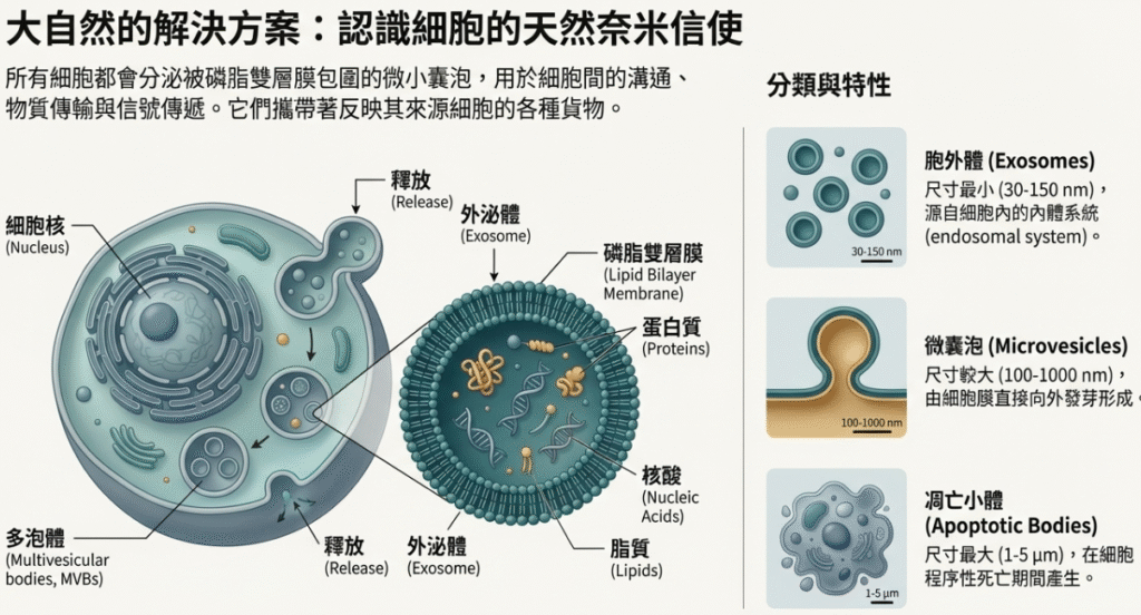 | 類別 | 形成機制 | 典型尺寸 | 生物分子 Cargo | 主要生物學功能 |