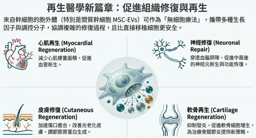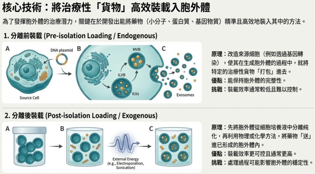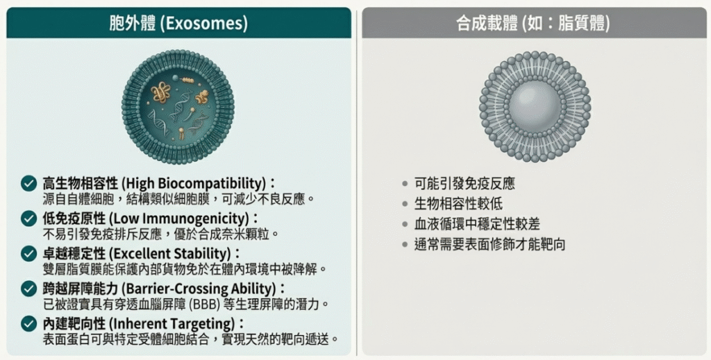 4. 作為藥物載體: 由於其天然組成(natural composition)、選擇性的細胞相互作用(selective cell interactions)、低毒性(low toxicity)、最小免疫原性(minimal immunogenicity)、生物相容性(biocompatibility)和穩定性(stability),EVs 成為極具潛力的藥物載體。