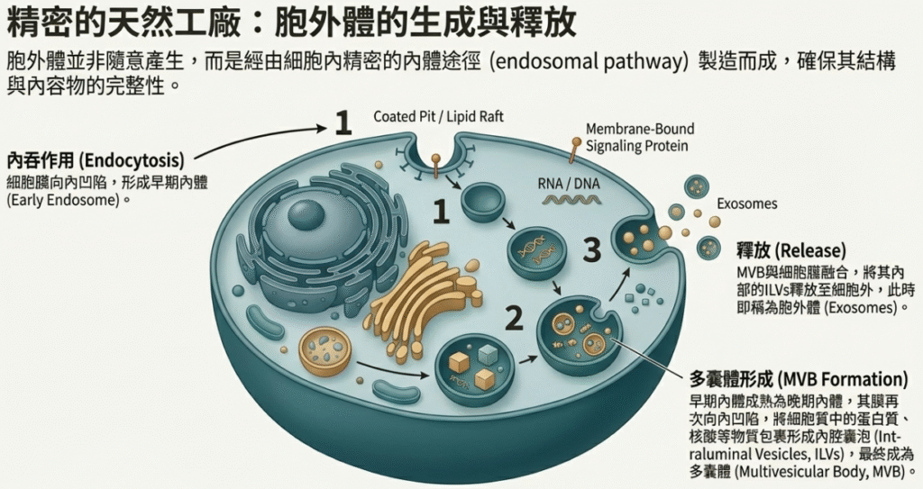 - MVB 與細胞膜融合 → ILVs 釋放至細胞外,即為 exosomes